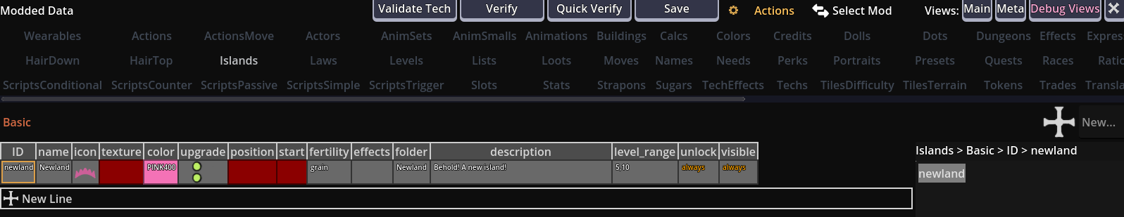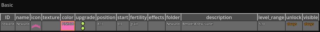 Now fill out the island data. You can leave the "texture", "position", and "start" cells empty, we'll fill them out later using a visual editor. If you use an ID that already exists in the base game your island will fully override the base game island.