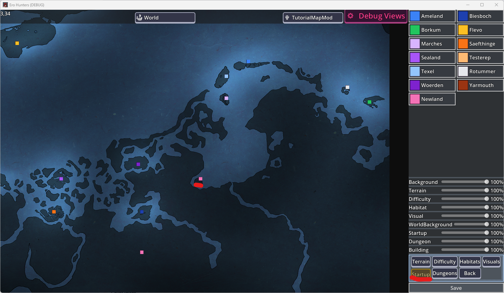 Click the "Startup" button on the right, select your island and move the tile to where you want the island to be. The little pin in-game is placed on the bottomleft corner of the tile. Don't forget to save!