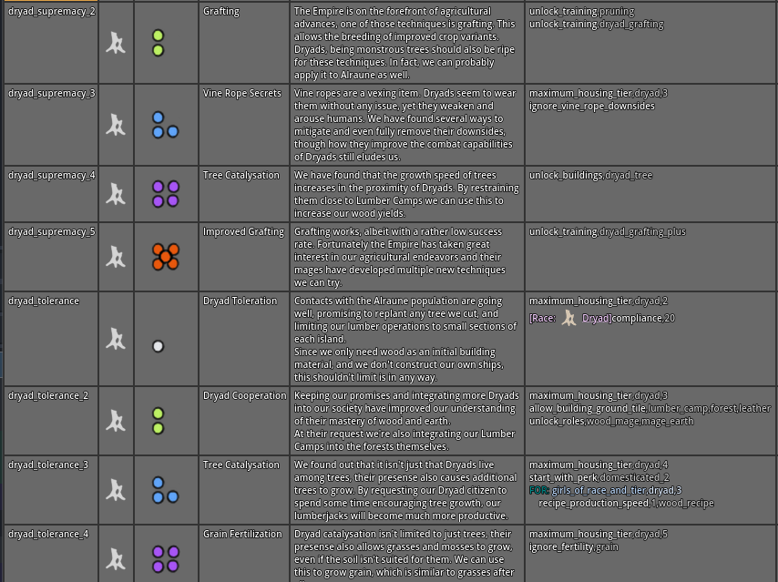Laws: The current law system, where different laws are similar between races and offer minor incremental benefits, was a placeholder. I'm currently reworking it so the vast majority of laws has interesting and unique effects. For example, Dryads can get a new beacon building, more flexible lumber camps, automated wood from citizen, a unique breeding mechanic using grafting, a way to ignore grain fertility, ways to make vine ropes useful for non dryad/alraune, and neither of the paths enforce restrictions on your core playstyle (except the supremacy path still limiting population tier to Citizen).
